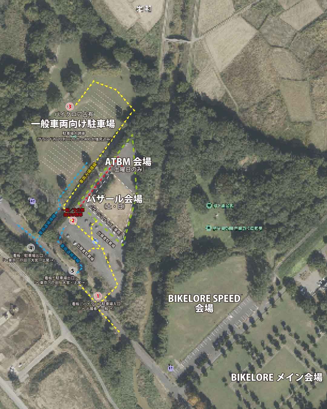- 万が一、Lサイズ出店が満車の場合は、スタッフの誘導に従いバイクロア専用駐車場へお進みください。併せてMサイズ出店への変更をお願いいたします。
