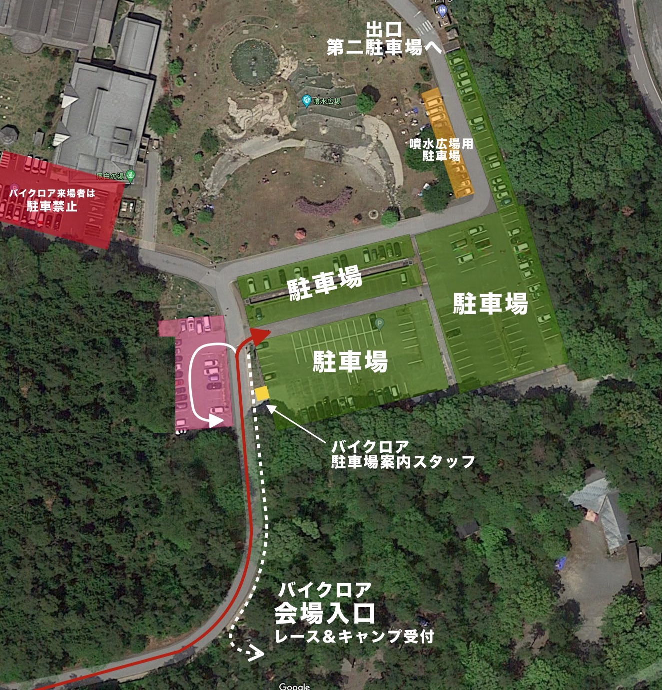 地図の赤部分、尾白の湯の前の駐車場には絶対に駐車しないで下さい。